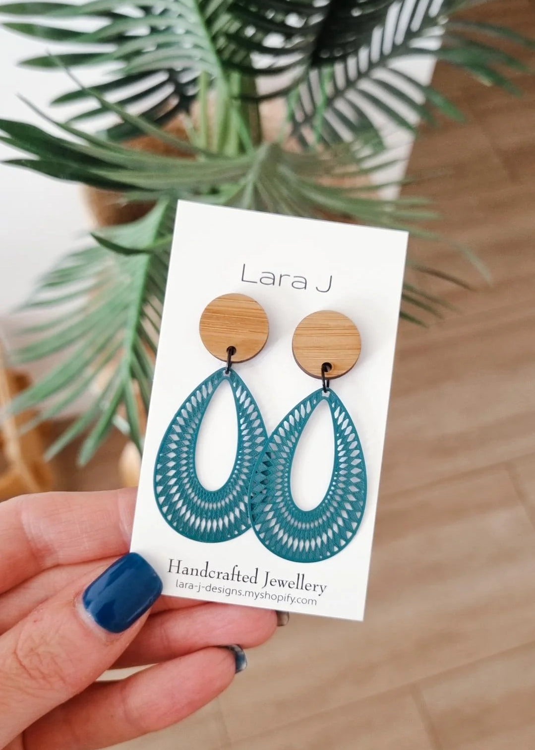 They feature beautiful timber/resin tops with hypo- allergenic posts which mean they are sensitive ear friendly.