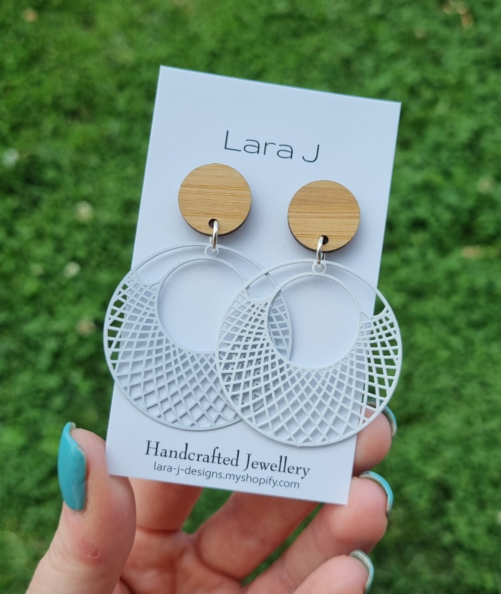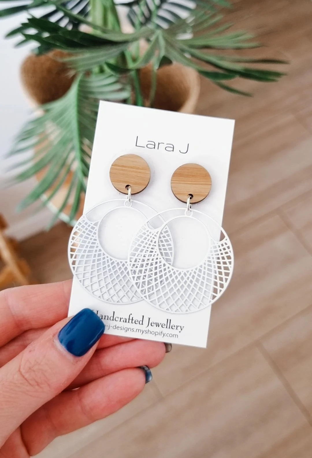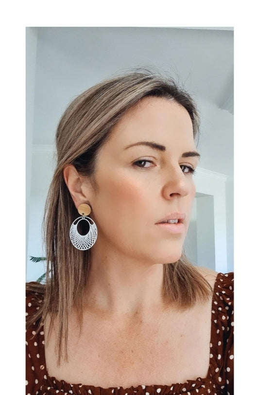 They feature beautiful timber/resin tops with hypo- allergenic posts which mean they are sensitive ear friendly.